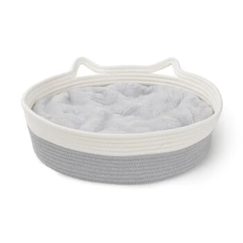 Bietet deinem Haustier einen gemütlichen Platz zum Schlafen und Entspannen. Leicht, einfach zu transportieren und tragbar für unterwegs. Die weißen Katzenohren verleihen dem Design einen Hauch von katzenhaftem Spaß. Natürliche cremefarbene und moderne graue Farbkombination. Inklusive superweichem Plüschkissen. Ganzjährig verwendbar, Kissen waschbar bei 30 Grad Celsius.