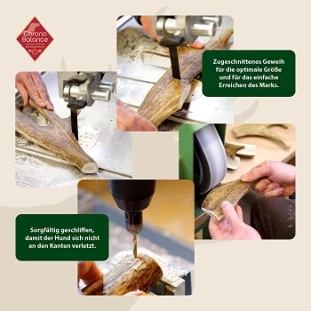 Das ChronoBalance Kaugeweih ist ein reines Naturprodukt und wird aus 100% abgeworfenem Damhirschgeweih gefertigt – für die Produktion werden keine Schlachttiere verwendet. Damhirsche werfen ihr Geweih einmal im Jahr auf natürliche Weise ab. Die aus dem Wald von Hand gesammelten Geweihstangen werden abgeschliffen und in die richtigen Größen zurechtgeschnitten, um einen hochwertigen Kauknochen für alle Art von Hunden zu garantieren.