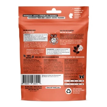 Unser ENERGY Snack ist die perfekte Belohnung für deinen Vierbeiner. Für den unwiderstehlichen Geschmack sorgen beste Zutaten mit klarer Herkunft, das nussige Aroma des Insektenproteins und Cranberries als PowerFood. Das nussige Aroma ist nur einer der vielen Vorteile von Insektenprotein. Endlich kann auch dein sensibler oder allergischer Hund wieder entspannt das Snacken genießen. Unsere glutenfreien und hypoallergenen Rezepturen auf Basis von Insekten-Monoprotein machen es möglich! Unsere ENERGIE Snacks sind durch die ausgewählte Form und Konsistenz die perfekte Belohnung für jede Situation.