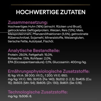 Bei PURINA PRO PLAN wendet unser Team von Ernährungswissenschaftlern und erfahrenen Tierärzten modernste Wissenschaft an, um die fortschrittlichste und effizienteste Nährstoffkombination für dein Haustier zu entwickeln. Diese Rezepturen helfen gezielte Vorteile wie eine hohe Verdaulichkeit und eine hohe Nährstoffaufnahme zu bieten, um die natürlichen Abwehrkräfte und die langfristige Gesundheit deines Haustieres zu unterstützen. Die Zutat Nummer 1 sind immer hochwertige Stücke von Huhn, Lamm, Lachs, Truthahn oder Rind, die tiefgefroren wurden, um wichtige Nährstoffe einzuschließen, und perfekt gegart für einen köstlichen Geschmack.