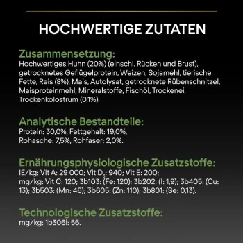 Bei PURINA PRO PLAN wendet unser Team von Ernährungswissenschaftlern und erfahrenen Tierärzten modernste Wissenschaft an, um die fortschrittlichste und effizienteste Nährstoffkombination für dein Haustier zu entwickeln. Diese Rezepturen helfen gezielte Vorteile wie eine hohe Verdaulichkeit und eine hohe Nährstoffaufnahme zu bieten, um die natürlichen Abwehrkräfte und die langfristige Gesundheit deines Haustieres zu unterstützen. Die Zutat Nummer 1 sind immer hochwertige Stücke von Huhn, Lamm, Lachs, Truthahn oder Rind, die tiefgefroren wurden, um wichtige Nährstoffe einzuschließen, und perfekt gegart für einen köstlichen Geschmack.