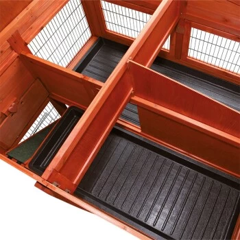 Die herausziehbare Kunststoffwanne ermöglicht eine schnelle und leichte Reinigung. Die verschließbare Bodenluke des Kleintierstalles ist mit Kunststoff beschichtet.